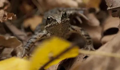 남성 개구리가 연못의 깊이로 향하기 위해 겨울을 보내는 동안 암컷과 청소년은 축축한 지역을 찾습니다. 가을에 그들을위한 완벽한 겨울 발굴을 만들어 오래된 성장하는 가방 , 잔디 깎기와 가을 잎.