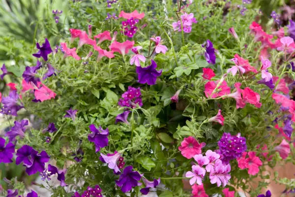 매달린 바구니를 심을 때는 색상 테마를 선택하고 고수하십시오. 여기서 분홍색과 자주색의 엄격한 혼합은 현대적인 트위스트로 전통적인 모양을 만듭니다.